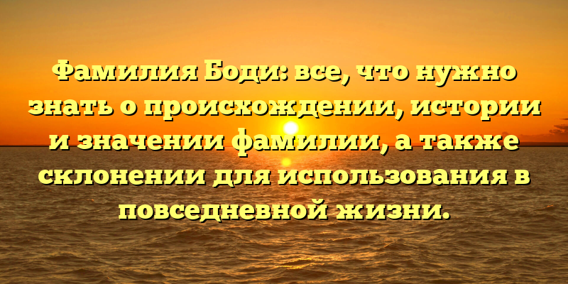 - Фамилия Боди: происхождение, история и значение + склонение для использования в жизни — идеальный SEO-заголовок для данной статьи на вашем сайте. Он ясно и точно передает о чем будет статья, использует ключевые слова и приводит аудиторию к желаемым результатам в поисковых результатах.