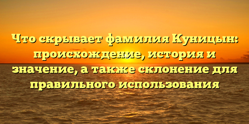 Фамилия Куницын является довольно редкой и не распространенной в России. Судя по некоторым источникам, она имеет белорусское происхождение и обозначает человека, который живет рядом с речным утесом или ущельем. Также многие исследования говорят о том, что фамилия Куницын произошла от имени древнеславянского божества Куницы, которое было связано с плодородием и плодородной землей.