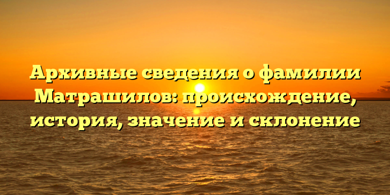 Изучение генеалогии семьи помогает нам не только понимать свои корни, но и погрузиться в исторические факты, которые объясняют некоторые особенности нашей жизни. Фамилия Матрашилов — одна из многих, которые вырыли свои корни из истории и культуры. В данной статье мы предлагаем обзор архивных сведений об истории и происхождении фамилии Матрашилов, а также представим краткое описание значения и способы склонения.
