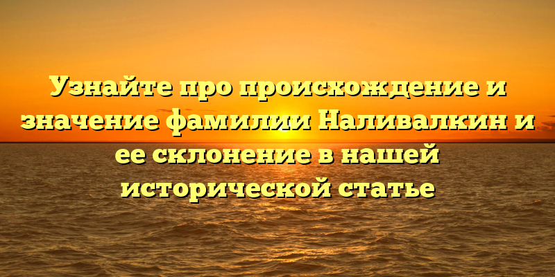Более подробная информация о происхождении и значении фамилии Наливалкин доступна в нашей исторической статье. Мы расскажем о том, как эта фамилия склоняется, какие существуют теории происхождения, а также деликатно затронем тему связи с народным занятием наливания напитков.
