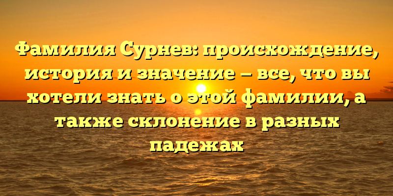 В данной статье мы расскажем о том, как возникла фамилия Сурнев, какие исторические события связаны с этой фамилией, а также о том, как склоняется эта фамилия в различных падежах русского языка. Если вы хотели узнать все о фамилии Сурнев — этот материал будет интересен для вас.