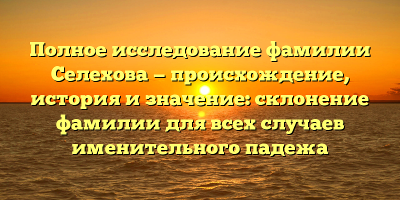 В данной статье мы представляем полное исследование фамилии Селехова — описание происхождения, истории и значения. Кроме того, мы также представляем склонение фамилии для всех случаев именительного падежа, что может быть особенно полезным для тех, кто занимается генеалогией и историей семейных родственных связей.